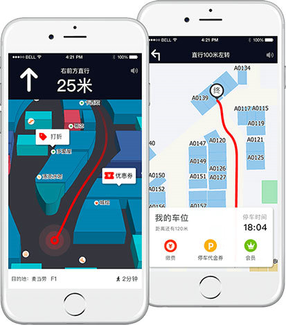 为顾客提供店铺及商品信息空间检索;高精度室内导航、公共设施指引;优惠票卷领用,场景互动和商场寻宝;智能停车等实用功能。